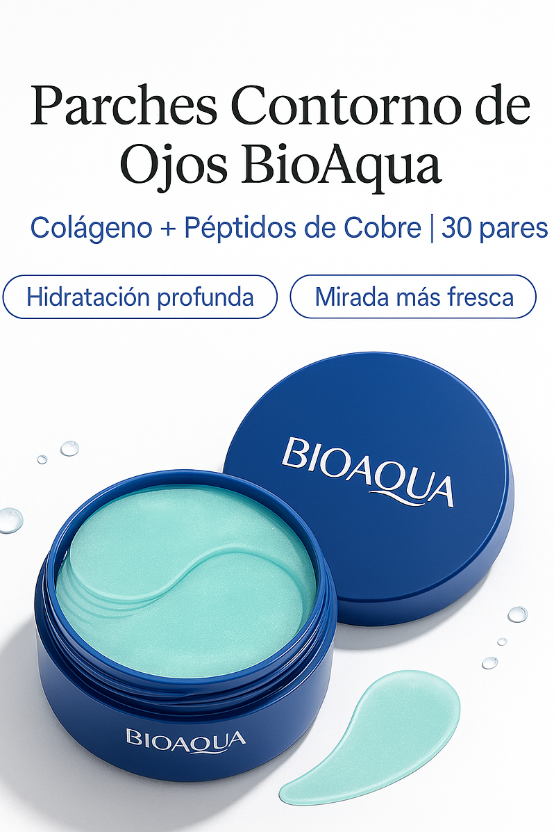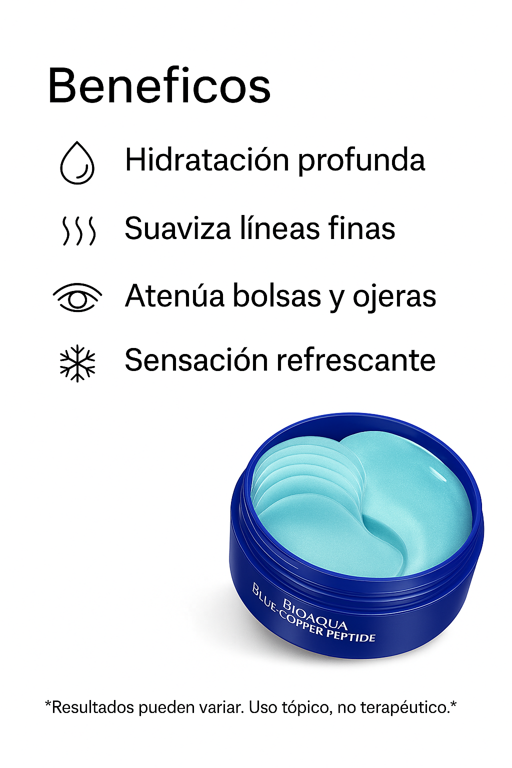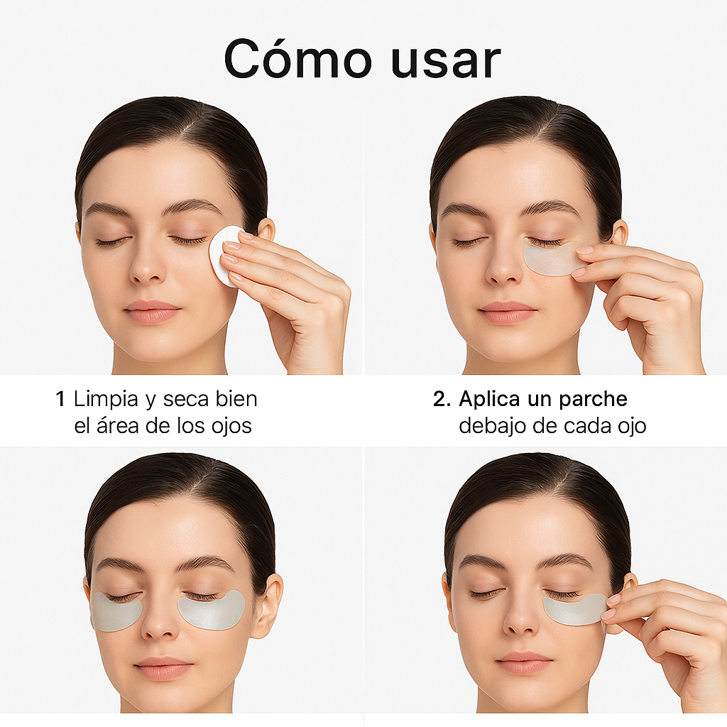 Cuidado específico para el contorno de ojos. Estos parches de hidrogel combinan colágeno y péptidos de cobre para aportar hidratación intensiva y una sensación de frescura que ayuda a suavizar temporalmente la apariencia de ojeras, bolsas e hinchazón. Su textura en gel se adhiere cómodamente a la piel y favorece la acción cosmética mientras descansas, trabajas o te preparas para salir.