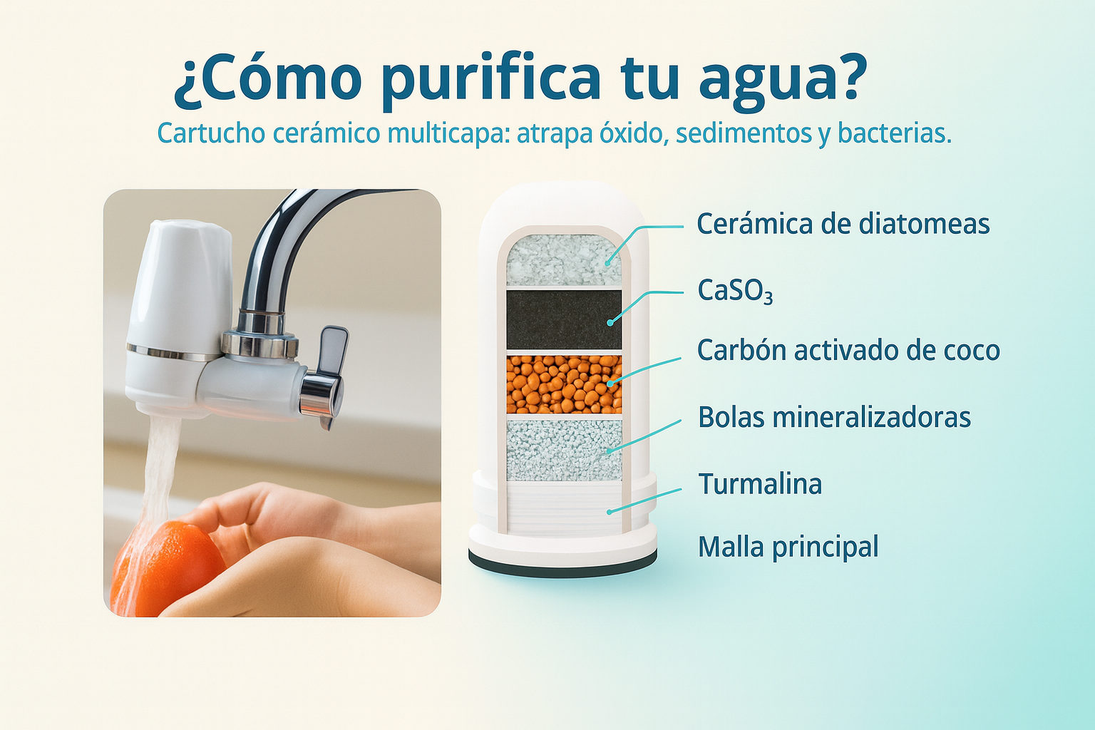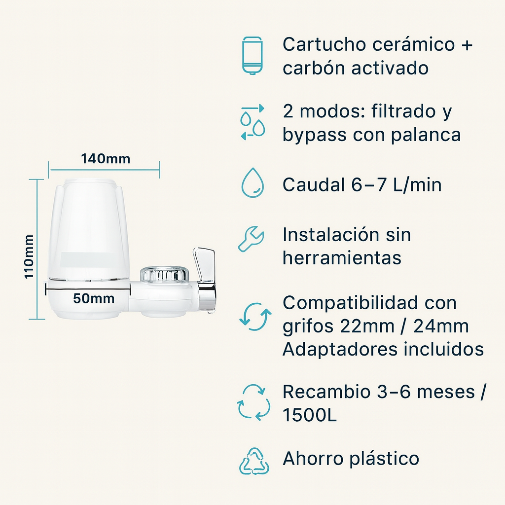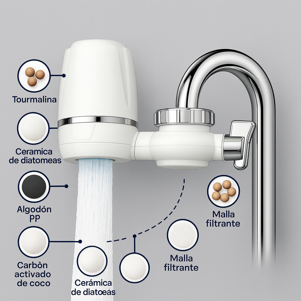 El agua pasa por un cartucho de cerámica microporosa que atrapa sedimentos, óxido y microorganismos. Resultado: menos cloro, mejor sabor. Se instala en 1 minuto, sin herramientas.